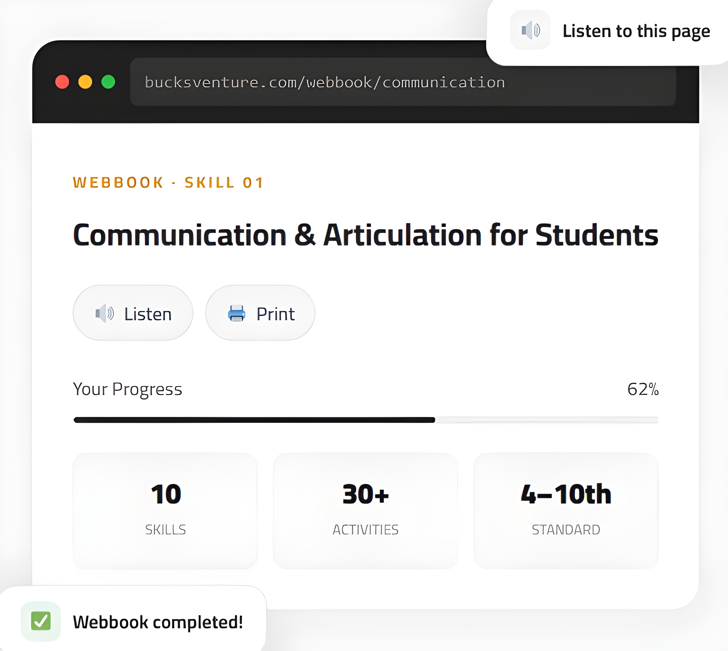 One dedicated webbook per skill — interactive, audio-enabled, printable, and built specifically for Class 4 to 10 students in India.